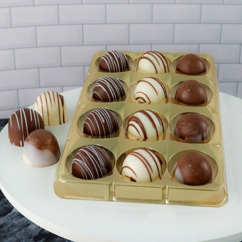 Embalagem Caixa Retangular p/ Trufas e Bombons com 12 Cavidades Redondas - Cor Ouro